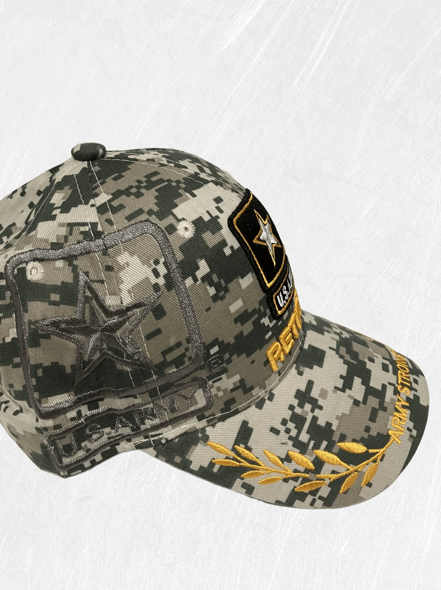 Celebrate your honorable service with the U.S. Army Retired Camouflage Cap—a meaningful accessory designed especially for proud veterans. Featuring premium camouflage fabric, an embroidered U.S. Army insignia, and bold gold ‘Retired’ lettering across the front, this stylish cap lets you showcase your dedication and legacy wherever you go. Made to fit comfortably, the adjustable strap ensures a perfect fit for most head sizes. Available in classic military green camo, this cap is the ideal gift for yourself or a fellow retired soldier.