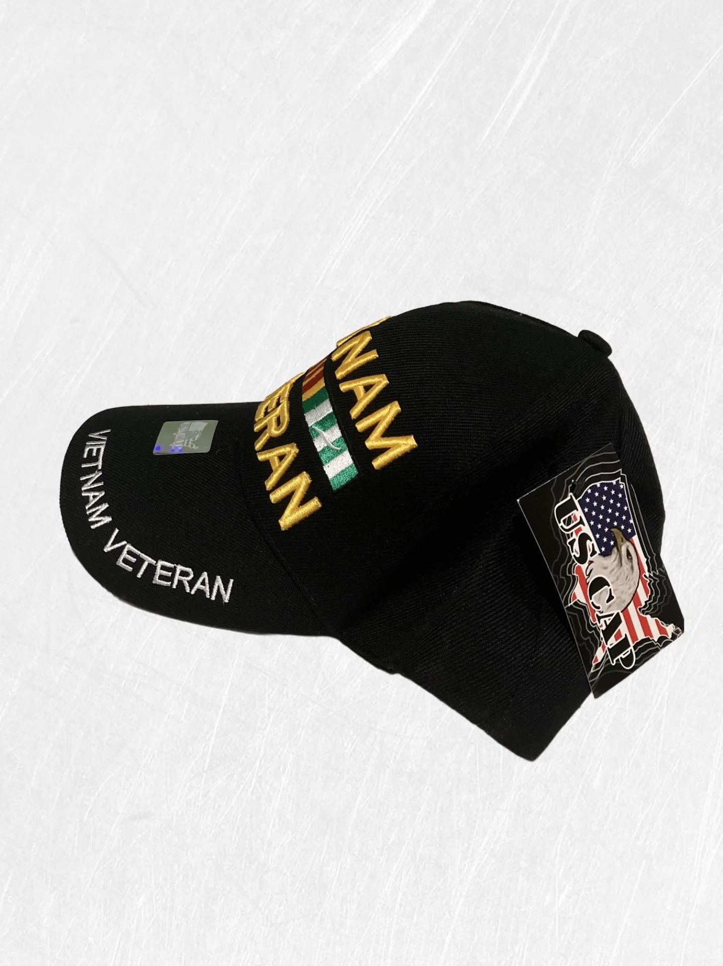 Honor service with our Vietnam Veteran Cap. Crafted in black, this durable cap showcases Vietnam Veteran in gold lettering, with vivid service ribbons on the front. Vietnam Veteran is also stitched on the brim for distinction. An adjustable strap ensures a comfortable fit. A perfect accessory for commemorative events or everyday wear, this cap is a tribute to heroism.